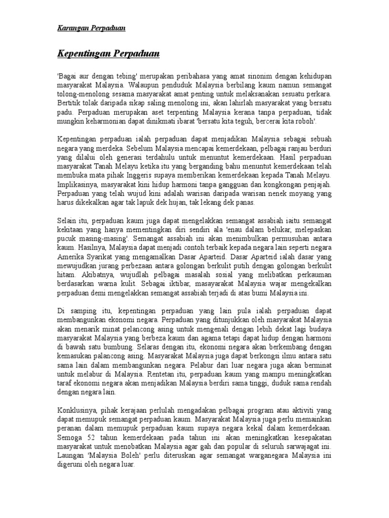 26499208 Contoh Karangan 1 from demo.dokumen.tips Kepentingan perpaduan kaum ialah secara berintergasi antara satu sama lain. Berikan maksud rangkai kata benih perbalahan. Sebagai rakyat malaysia, pasti kita sudah tidak asing lagi dengan wujudnya masyarakat berbilang kaum di negara kita seperti cina,melayu,india,kadazan dan sebagainya. Selain itu, pada masa ini juga aktiviti kemasyarakatan dapat mengukuhkan perpaduan kaum di negara kita. Perpaduan rakyat dapat menjamin kedaulatan bangsa dan negara. Kepentingan lain perlembagaan malaysia adalah memastikan pentadbiran dan pemerintahan yang adil dan telus dapat dilaksanakan. Realiti kepelbagaian kaum ke arah perpaduan nasional. Peribahasa rambut sama hitam, hati.