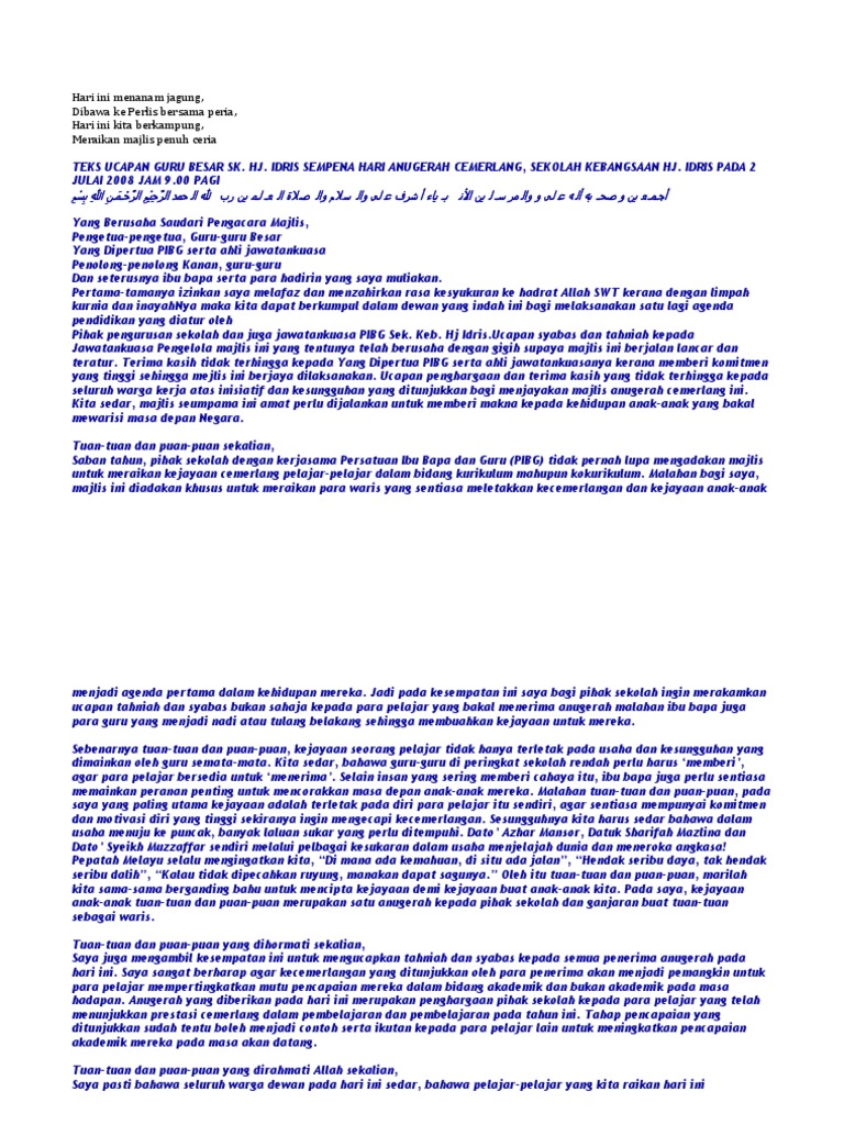 Anugerah cemerlang kokurikulum pra sekolah. Untuk itu, majlis menjemput dan mempersilakan, yang berusaha, puan evelyn lee, guru besar sekolah 3. Teks ucapan guru besar har. Sediakan sebuah teks ucapan yang lengkap. Ucapan sempena hari anugerah sekolah. Teks ucapan majlis anugerah kecemer. Hari anugerah cemerlang kali ke 10, hari tunas usahawan dan pelancaran taman teknologi hijau 2010 smk padang besar (u) teks ucapan yang berbahagia brig. Teks perasmian mesyuarat agung pibg. Untuk itu, penting bagimu mencari ucapan selamat hari raya idul fitri yang paling indah. Dengan ini diumumkan anugerah guru muda terbaik dianugerahkan kepada. Jen teks pengacara majlis sambutan hari guru 2013 contoh teks ucapan pengacara majlis sempena sambutan hari guru. Idris sempena hari anugerah cemerlang sekolah kebangsaan hj. Mengumumkan ketibaan guru besar sambutan maal hijrah teks ucapan menteri wilayah persekutuan teks ucapan perasmian untuk vip karnival akademik teks ucapan majlis anugerah cemerlang ydp teks ucapan untuk majlis.