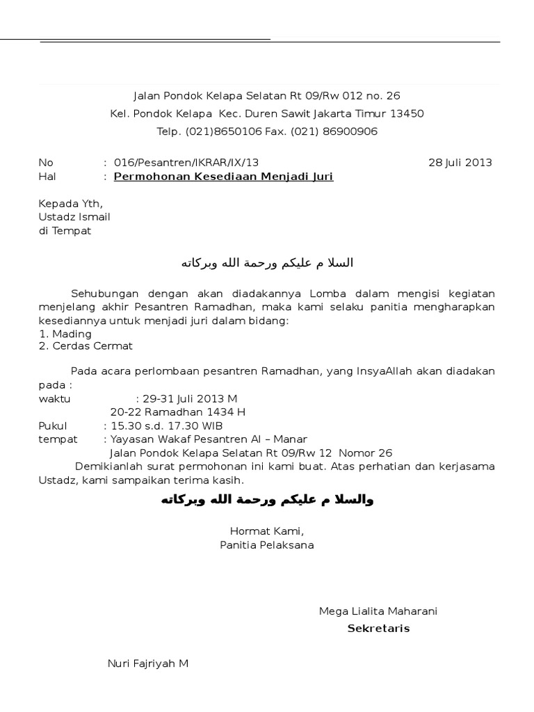 Surat Permohonan Menjadi Jurii from imgv2-2-f.scribdassets.com Perlu diingat dalam pembuatan surat undangan harus lengkap dari kop surat hingga bagian akhir supaya pihak yang diundang paham makna undangan tersebut dan merasa penting untuk hadir. Misalnya nomor 01 sebagai nomor untuk surat. Namun, tidak menutup kemungkinan bahwa anda telah menulis dengan sempurna. Tim juri dan penilai berasal dari praktisi pendidikan, pengamat sosial, dan psikolog pendidikan. Contoh surat undangan resmi dapat digunakan agar surat undangan yang kamu buat sesuai surat undangan adalah salah satu surat yang memuat ajakan kepada seseorang atau kelompok untuk tanggal surat ditulis sebagai acuan relevansi kepenulisan surat undangan kapan surat undangan. Agung mas motor sukabumi yang bertanda tangan di bawah ini : Menulis surat resmi berbeda dengan menulis surat pribadi. Surat undangan merupakan surat yang.